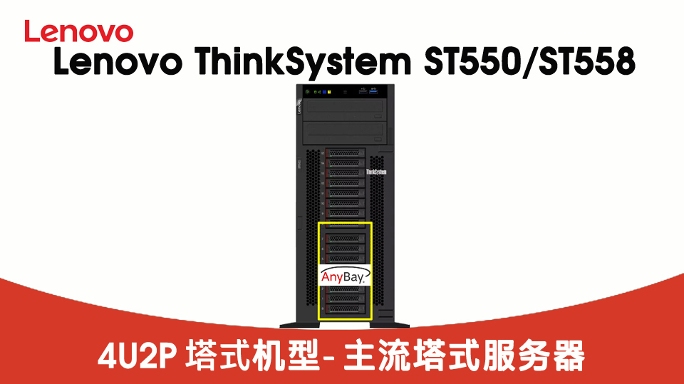 联想 ThinkSystem ST550/ST558 塔式服务器平台 支持2个CPU,12个内存插槽,无阵列卡,集成双口千兆网口,标配无电源,无内存,无硬盘,多达 16 个 2.5 英寸(包含 4 个 NVMe)托架或 8 个 3.5 英寸托架.