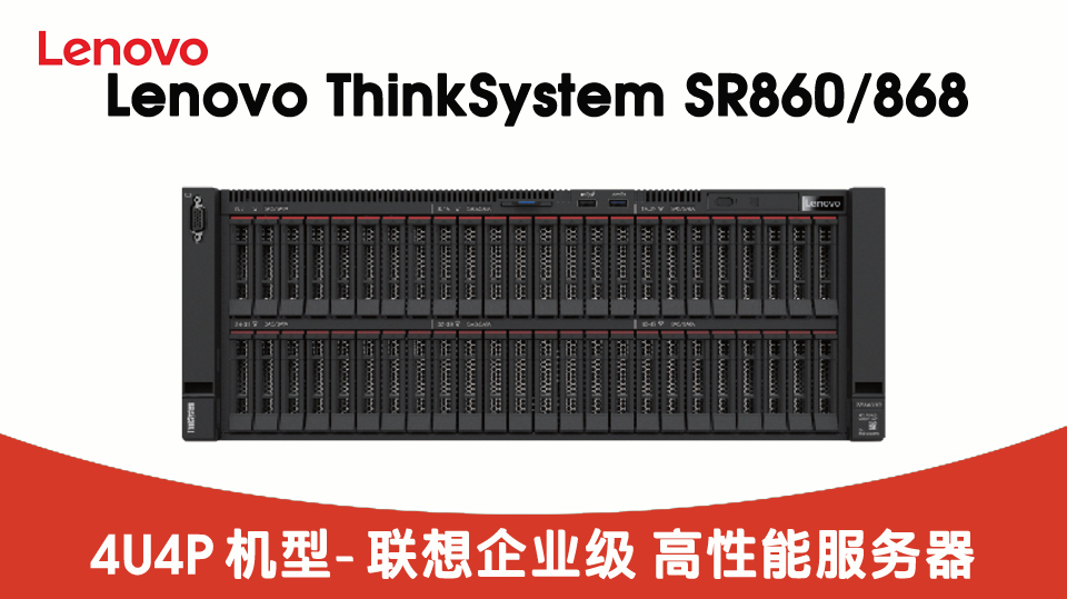 Lenvov ThinkSystem SR860/SR868 服务器 - 四路 4U 机架式服务器,采用第2、3代Intel Xeon 可扩展处理器,48个内存插槽,支持8个单宽或4个双宽GPU,多达48个2.5英寸HDD 和SSD 存储托架,支持RAID卡,4个电源,适用于计算密集型负载。